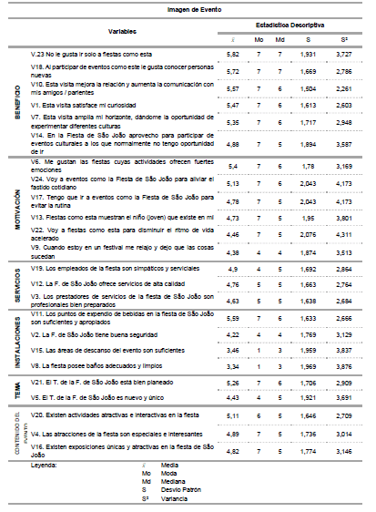 De acuerdo con la metodología adoptada, los aspectos que forman parte de la imagen de un evento son: beneficio, instalaciones, servicios, tema, contenido del evento y motivación. Por lo tanto, son esos los aspectos que forman parte de la construcción de la imagen de la fiesta de São João.