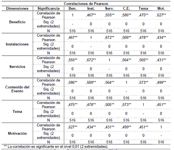 Posteriormente, se llevó a cabo la correlación de Pearson, que buscó identificar si las dimensiones de la imagen de eventos poseen alguna relación entre sí. Finalmente, con la aplicación de la regresión logística se buscó verificar cuáles de las seis dimensiones tenían un mayor poder de explicación de la satisfacción de los encuestados: beneficios, instalaciones, servicios, contenido del evento, tema o motivación.