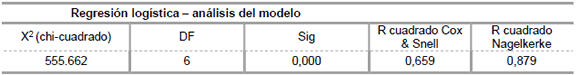 El Pseudo-R², también está presentado en la tabla anterior en sus formatos de Cox & Snell y Negelkerke. Los resultados del Pseudo-R² indican que el modelo se ajusta adecuadamente al fenómeno, a partir del momento en que los R² de Cox & Snell y Negelkerke resultaron respectivamente 0,659 y 0,879, se destaca de esta forma un poder predictivo considerable proveniente de la ecuación.