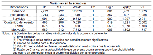 En este sentido, con la aplicación de la regresión logística se buscó verificar cuáles de las seis dimensiones tendrían un mayor poder de explicación para la satisfacción de los encuestados: beneficio, instalaciones, servicios, contenido del evento, tema o motivación. Para esto se utilizó el método Wald (indicación de las variables que son estadísticamente significativas), con un 5% de confiabilidad como criterio de entrada de los análisis y un 10% de confianza de salida. Las variables fueron transformadas en dicotómicas siendo: