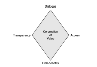 El diálogo implica comunicación, interacción y la intención de generar soluciones por parte de los involucrados. El acceso se refiere a la capacidad que tienen los involucrados en obtener información para alimentar el proceso de co-creación. En ese sentido, la transparencia es un elemento crucial para dicho acceso. Internet permitió que sus usuarios obtengan información disponible en la web que antes sólo era posible para las organizaciones. En relación a los riesgos y beneficios, este elemento considera que el usuario tiene el poder de tomar decisiones respecto a la información que puede beneficiarlo, así como también generarle efectos negativos, por lo cual le demanda una mayor responsabilidad a la hora de utilizarla.