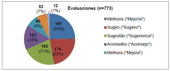 La selección de palabras no fue arbitraria y se consideraron aquellas que pudiesen generar como resultados de búsqueda las evaluaciones con los indicios más fuertes de co-creación de valor, a partir de manifestaciones textuales que presentasen intenciones, predisposiciones o tentativas de co-creación para la obtención de inferencias sobre este fenómeno. Para ello se utilizaron como palabras clave sustantivos y verbos en forma singular, en función de los comentarios de los huéspedes individuales, y plural, debido a la presencia de evaluaciones realizadas por un grupo de dos o más huéspedes, como puede ser una pareja o familia. Para la selección de los términos y palabras relacionadas se utilizó el sitio web “Dicionário de Sinônimos Online” (www.sinonimos.com.br), un diccionario de sinónimos en idioma portugués. El criterio de búsqueda de palabras clave utilizado permitió obtener como resultado un total bruto de 773 unidades de análisis a partir de las evaluaciones de los huéspedes (CVO) (Gráfico 1):