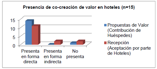 A partir del análisis de la comunidad virtual observada como ambiente de co-creación, en un segundo momento se identificaron en las interacciones entre huéspedes y hoteles la presencia de indicios que manifestasen propuestas de valor, en forma de contribuciones por parte de los primeros, para la mejora de la calidad en los servicios (Gráfico 2). De la muestra de evaluaciones observadas en los 15 establecimientos, en 14 hoteles se identificaron contribuciones de consejos de mejora de calidad en los servicios. Esto permite afirmar una intención clara por parte de los huéspedes de participar del proceso de creación de valor en conjunto con los medios de hospedaje en comunidades virtuales.