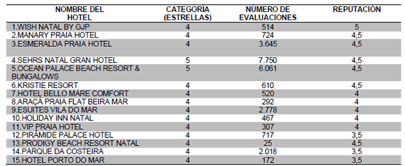 Con el fin de delimitar el tipo de alojamiento que constituye el universo de la investigación, se partió de un total de 409 establecimientos registrados de la ciudad de Natal y se aplicó un filtro de búsqueda por hoteles tradicionales. De ese modo, se descartaron posadas y hoteles especializados (como hostels, albergues o apartamentos). De los 96 hoteles restantes, el presente estudio consideró los hoteles mejor “clasificados” en forma orgánica por el algoritmo con base en las evaluaciones de los huéspedes dentro de las categorías 4 y 5 estrellas. Aquellos hoteles patrocinados para posicionarse entre los primeros lugares fueron descartados. Luego de ser aplicados estos filtros de búsqueda se llegó al total de 15 (Tabla 1), correspondiente al número de los hoteles tradicionales de cuatro y cinco estrellas mejor clasificados de la ciudad de Natal, Brasil.