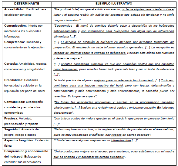 A partir del análisis de contenido desde la perspectiva del método netnográfico, fue posible observar, analizar y extraer ejemplos ilustrativos de las propuestas de valor generadas por los informantes, en este caso huéspedes, tomando como punto de partida el conjunto de determinantes de calidad percibida en servicios de Parasuraman, Zeithaml & Berry (1985) (Cuadro 1).