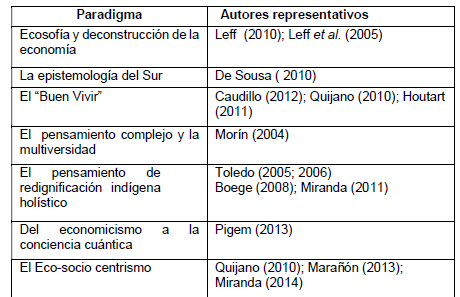 Dicha lógica interpreta el mundo desde el ‘eurocentrismo’, el ‘pensamiento colonial’, el ‘pensamiento unidimensional’, el ‘neocolonialismo’ y el ‘post-extractivismo’, que puede resumirse en la visión ‘antropocéntrica’. No son deliberaciones parejas, difieren entre sí, pero en esencia los une el cuestionamiento de la insostenibilidad del sistema imperante por las secuelas alarmantes a nivel mundial, exteriorizada especialmente en la crisis medioambiental. Autores como Emmanuel Wallerstein, Serge Lathouche; Enrique Leff, Boaventura de Souza, Aníbal Quijano, Francois Houtart, Edgar Morín, Víctor Toledo, Jordi Pigem y muchos otros vienen analizando el tema (Miranda & Santana, 2014).
