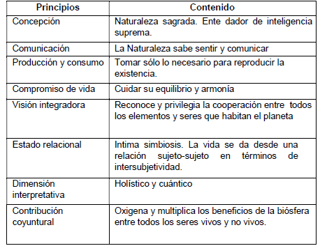 El paradigma ecosociocéntrico, parte de considerar al ser humano como segmento de la cadena de vida, donde todo lo que le pasa a un miembro de este sistema afecta al otro y al ecosistema en menor y mayor grado (Gráfico 1). Ubica al ser humano desde una relación simbiótica y sagrada que mantiene con la Naturaleza y el cosmos, asumiendo un sentido de identidad y pertenencia con la Vida. El Cuadro 2 resume los principales principios del enfoque ecosociocentrista.