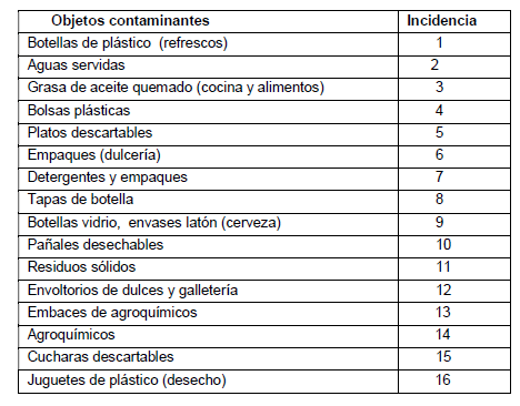 Cuestionar la contaminación ambiental especialmente del agua es el tema de mayor recurrencia y debate hoy en día. Para nadie es un secreto que especialmente el plástico es el principal ente de contaminación de los ecosistemas, del paisaje y especialmente de la vida en sí, que genera una laguna y su entorno. “La contaminación por plástico (botellas especialmente), es una de las más significativas en la actualidad, ya que una botella plástica tarda alrededor de 700 a 1000 años en degradarse” (Konji & Doku 2015 citado por Gómez, 2016: 70). La cantidad de plástico y botellas PET que se produce a diario es arrojado a los “tiraderos” (que son ríos, lagunas, barrancas), donde el ciclo de su descomposición no alcanza a empezar cuando ya está llegando más; es esta la razón por la cual los tiraderos se llenan y por consiguiente los consumidores los votan en la calle (Gómez, 2016: 20). El Cuadro 3 grafica la incidencia de la presencia de residuos sólidos según mayor frecuencia en el humedal de estudio.