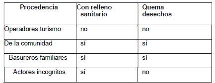 “Plásticos es más, como botellas, bolsas o de lo que mismo comen, compran sus galletas o chizito y lo botan, a veces preparan comida y todo lo dejan ahí votado. Vienen a recoger, con moto; alrededor de la laguna también lo recogen, pero no sé para dónde llevarán para que lo boten”. “(…) él tiene un pozo que él mismo hizo y que ahí bota sus desechos tanto de su hogar como su recreo, el recicla y vende las botellas, trata de no contaminar el medioambiente”.