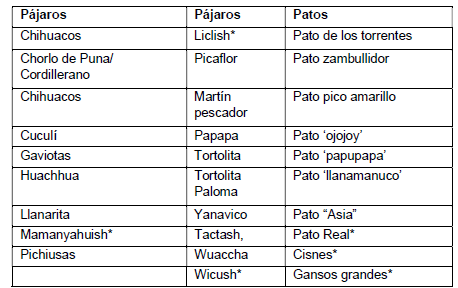 “El papapa, el tactash, los patitos bien chiquitos, los zambullidores, las gaviotas que vienen de junio a setiembre a pernoctar acá son miles, en esa época llegan, ahora no hay. Había con picos amarillos, picos celestes, pico rojo, gallaretas, gansos grandes como cisnes, wuaccha, palomas caceras, pero ya no hay, ya no se ven”.
