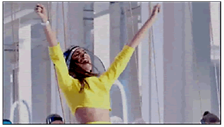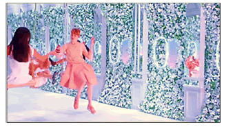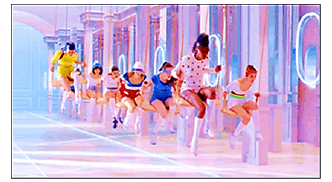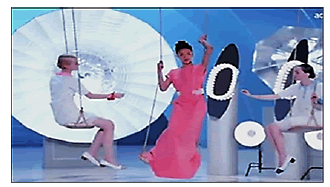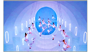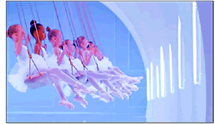 Al repetir la frase “Come on Shout...” el escenario cambia y rápidamente se muestran pequeñas bailarinas con tutús blancos en los columpios realizando diversos pasos de ballet y algunas piruetas en el aire (Figura 16). El escenario es fluido (aéreo) debido a la coloración de azules y blancos y las ventanas están iluminadas por luces de neón blancas que orientan la mirada a un gran círculo cerrado de color azul fuerte. Esta composición visual causa el efecto de ser un gran ojo, el ‘espíritu de Francia’ está encarnado allí y alude a un homenaje a las artes y espectáculos franceses de danza. El sonido de la música es instrumental hasta casi el final del bloque cuando se escucha “Hei shout...” (hey grita...).