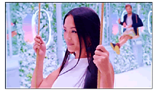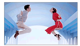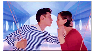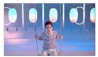 Él también es pelirrojo, de piel muy clara, y usa un pantalón blanco con un suéter a rayas azul marino y blanco, un traje típico de los jóvenes franceses. La pareja va y viene en los columpios como si fueran adolescentes intentando darse el primer beso. La música instrumental gana volumen y acelera el ritmo acompañando el swing de la escena romántica. Esta composición visual está cubierta en el plano de fondo por el color azul-celeste causando la impresión de que la pareja está en el aire. En estas superficies se incrustan formas ovaladas, rectangulares y horizontales como las ventanas del avión y las nubes, compuestas por el degradé de azul, rosa y blanco. Nuevamente se abre la imagen en un plano general y se visualizan las figuras de los jóvenes (Figura 5) hamacándose cada vez más alto e intentando intercambiar un beso mientras se oyen las voces suaves del dúo Glass Candy expresando la frase musical “France in the air”.
