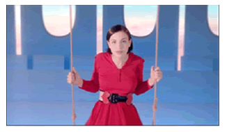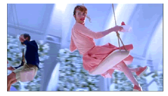 Ella está con los ojos cerrados, su piel es clara, los labios carnosos en forma de corazón, el cabello corto estilo Chanel, a la francesa. Rápidamente el rosto se aleja y la imagen se abre en un plano general, donde se ve el cuerpo entero en un columpio (Figura 3).