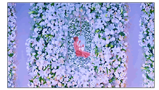 En la última imagen del bloque la figura de la pelirroja entra con su hamaca dentro de una guirlanda de flores con dulces en las manos (Figura 15), mientras se escucha “Come on shout” (vamos a gritar), nuevamente risas y otra vez “Shout...” (grita) hasta que el personaje sale al otro lado de la guirnalda de flores. Este conjunto de elementos visuales causan un efecto de belleza estética de la marca, pero también los sentidos de hospitalidad de la letra de la canción refuerzan la idea de que volar por Air France significa recibir al enunciatario con alegría, belleza y satisfacción por el placer francés de vivir.