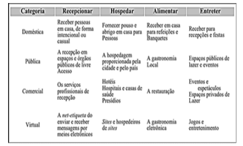 Camargo (2004) fue uno de los autores brasileños que procuró explicar la hospitalidad por medio de sus espacios (doméstico, público, comercial y virtual) y acciones (recepcionar, hospedar, alimentar y entretener), generando posibilidades de interacción entre dichos elementos. A pesar de coincidir con Tomillo Noguero (2013: 162) quien establece que "no existe un único estándar de hospitalidad" y con Brusadin & Panosso Netto (2016) que afirman que falta una comprensión epistemológica de la hospitalidad, se optó por adoptar como punto de partida la definición de Camargo (2003: 19), para quien “la hospitalidad puede ser definida como el acto humano ejercido en un contexto doméstico, público o comercial, que involucra el acto de recibir, hospedar, alimentar y entretener personas”. El autor avanzó en el abordaje de Lasley & Morrisson (2004) al proponer una visión unificadora de los conceptos entre las dos escuelas teóricas identificadas hasta entonces. Esta propuesta de conceptualización de la hospitalidad amplía el concepto y el fenómeno más allá del territorio, mostrando que aún en un contexto doméstico pueden existir elementos comerciales de la hospitalidad y viceversa (Figura 1).