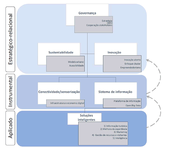 1) estratégico-relacional a través de los principios de la gobernanza, la sustentabilidad y la innovación y sus respectivos derivados; 2) instrumental, vía la conectividad y el sistema de información, originario de sus especificidades; y 3) aplicado, que da lugar a las soluciones inteligentes, oriundas de sus peculiaridades. No obstante, los autores dejan claro que el éxito del modelo sólo será alcanzado si hubiera comunicación y un intercambio efectivo de información y soluciones entre esos niveles.