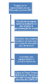 Más allá de beneficiar a las 70 Estancias paulistas, la nueva ley regulariza la clasificación de más de 140 municipios MIT, totalizando 210 ciudades que reciben recursos para el crecimiento del turismo paulista. Las condiciones para la clasificación como MIT son indicadas como acciones básicas para el desarrollo del turismo con presentación del potencial turístico de los atractivos, los servicios médicos locales, los equipamientos y servicios turísticos en el lugar o región, la infraestructura de saneamiento básico para atender al visitante y la población local, el plan director de turismo actualizado y revisado, y un COMTUR activo y deliberativo que presente las actas de las últimas reuniones (São Paulo, 2016). Además de esas condiciones los criterios para la clasificación como MIT deben ser presentados por un diputado con los documentos que se ilustran en la Figura 1.