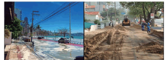 En la región de Santos (SP), los eventos como la invasión brusca del mar (resacas) han crecido vertiginosamente. De los 236 eventos sucedidos entre 1928 y 2016, el 73% ocurrió a partir de la década de 2000, con una tendencia al crecimiento en la frecuencia de las ocurrencias debido al aumento de los extremos meteorológicos como tempestades, una de las causas de las resacas (PBMC, 2017). Las implicaciones para el turismo de la región, que está entre los 10 destinos más buscados por los brasileños, son muchas, pues además de sumergir la playa, las resacas pueden inundar las infraestructuras de la orla como quioscos, ciclovías, calles y avenidas (Figura 3), además de interferir en el atraco de los cruceros.