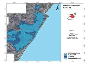 La capital de Pernambuco, Recife, es el tercer destino más demandado en el nordeste brasileño (Brasil, 2019). También fue considerada la más vulnerable de la región en los estudios publicados en el informe del PBMC (2017), principalmente debido a las inundaciones causadas por el mar o las precipitaciones severas. Con 4m por encima del nivel del mar, un aumento de 50cm en el nivel medio (escenario optimista) se puede inundar al menos 25,38km2 de Recife. Si se eleva 1m, el área inundada aumentaría a 33,71km2, lo que la coloca en la 16ª posición como la ciudad más vulnerable del mundo al cambio climático (PBMC, 2017). Buena parte del tradicional barrio turístico de Boa Viagem y Pina se inundarían (Figura 7) y cerca del 81,8% de las construcciones urbanas que están a menos de 30m de la línea de la costa pernambucana y en terrenos por debajo de 5m, serían alcanzadas por el mar (PBMC, 2017).