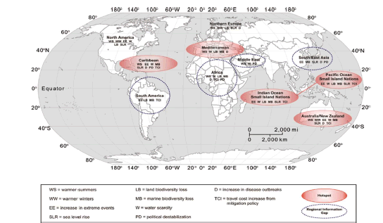 La literatura sobre cambio climático y turismo ha crecido de forma substancial, pero las investigaciones predominan en los países desarrollados del hemisferio norte y Oceanía, habiendo consenso en la literatura sobre la falta de datos regionales de países en desarrollo. La Figura 1, del año 2008, realza en los círculos de puntos el vacío en la investigación, y aunque haya pasado una década poco ha cambiado.