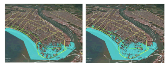 Marengo et al. (2017) realizaron un estudio sobre los impactos económicos en Santos (SP) adelantando el aumento del nivel del mar. Utilizando diversos modelos, proyecciones de la elevación del mar y análisis económicos, los autores concluyen que las pérdidas en el mercado inmobiliario, debido a la desvalorización de los inmuebles, incluyendo edificios hoteleros, puede alcanzar los 400 millones de dólares en 2100 si el mar inunda parte de la ciudad (Figura 4). El estudio no consideró las posibles pérdidas de empleo (en diversos sectores como el turismo), las inversiones en infraestructura urbana realizadas por el municipio como pavimento, saneamiento, electrificación, etc., que se considera incrementaría substancialmente los costos estimados. En el ámbito del turismo, existen aún otros impactos que son complejos de medir como los sociales y culturales, por ejemplo las localidades donde se realizan manifestaciones culturales.