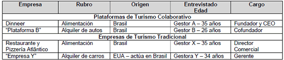 La selección de los casos involucró la búsqueda de empresas de Turismo Colaborativo activas de origen brasileño o con actuación en Brasil. Sus rubros de actuación sirvieron de base para la búsqueda de empresas tradicionales activas, brasileñas o con actuación en Brasil. Dos de ellas, una plataforma y una empresa de turismo tradicional optaron por ocultar su identidad, siendo denominadas “Plataforma B” y “Empresa Y”. El Cuadro 1 muestra las cuatro empresas seleccionadas.