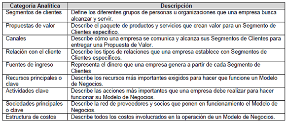 Las grabaciones y transcripciones de las entrevistas fueron almacenadas en el archivo del proyecto creado por medio del software Atlas.ti. Posteriormente, el contenido de las transcripciones fue organizado de forma de permitir la separación en fragmentos que presentan evidencias concernientes al objetivo de investigación. Dichos fragmentos fueron clasificados a través de categorías de análisis específicas y predefinidas, basadas en la literatura (Eisenhardt, 1989; Yin, 2001; Bardin, 2002). De esa forma, para definir las categorías analíticas se utilizó la taxonomía de Osterwalder & Pigneur (2011), conocida como Business Model Canvas. Dicho framework es una herramienta que posee 9 bloques, que juntos muestran la forma de creación, entrega y captura de valor por parte de la organización (Cuadro 2). Esta elección se debió a la amplitud del mismo, que detalla el modelo de negocio de la empresa en base a 9 componentes interrelacionados, además de su aplicabilidad a empresas tradicionales y de internet.