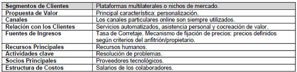 En lo que concierne a las plataformas de Turismo Colaborativo, como puede observarse en el Cuadro 4, buscan alcanzar segmentos de pares interdependientes o nichos de mercado. Se reitera que la plataforma Dinneer no está clasificada como Plataforma Multilateral por considerar al proveedor de servicio como producto y no como cliente. El foco en la personalización de la propuesta de valor denota que el propósito del Turismo Colaborativo es ofrecer al turista del siglo XXI experiencias originales, significativas y auténticas, transformándolo en autor de las mismas, lo que confirma la descripción de Forno & Garibaldi (2015). En cuanto a los clientes, se accede a ellos por medio de canales particulares online. Dicha convergencia en los canales de internet se justifica por la propia naturaleza tecnológica de las plataformas (Carroll & Romano, 2011 citado por Belk, 2014). La relación con los clientes se da por medio de servicios automatizados aprovechando la tecnología de las plataformas, la asistencia personal enfatizando la originalidad (Forno & Garibaldi, 2015) y la cocreación de valor (Osterwalder & Pigneur, 2011) solidificando la personalización de los servicios. Considerando dicha individualización, todas las plataformas tienen como fuente de ingresos la tasa de corretaje por una fijación de precios definida según los criterios del proveedor de servicios en coincidencia con ese mismo principio. Los recursos y los costos más importantes son las personas que forman parte de la institución y sus salarios.