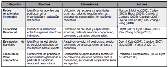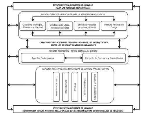 Teniendo en cuenta la contribución para toda la red relacional informal, sin la dependencia de convenios formalizados con el organizador del evento, para comercialización o divulgación, este artículo permite entender que la capacidad relacional y la construcción de redes de relación informal son relevantes como estrategia para la creación de valor compartido en el sector de turismo. En esta investigación se analiza el caso del Festival de Danza de Joinville. Lo que se identificó fueron potenciales oportunidades, tanto para el evento como para el sector. Al considerar los agentes directos e indirectos involucrados en esta red relacional del Festival, los resultados de las interacciones permiten la movilidad de sus recursos y capacidades para modificar, ampliar y alterar las bases existentes. La percepción de los agentes involucrados es la de que esta operación estratégica proporciona diferentes oportunidades de negocios.