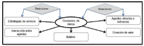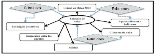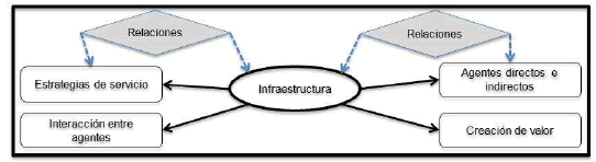 La información generada en la Figura 4 muestra dos relaciones “directas”: a) entre la infraestructura y las estrategias de servicios, y b) entre la red relacional y la estrategia de servicio. Como estas relaciones se refieren a los aspectos que dependen de la estructura de otros agentes, para que las estrategias se den en su totalidad, los agentes deben cumplir su función en la red relacional informal para cubrir las necesidades del turista del Festival. Estos aspectos influencian la relación parcial de la interacción entre los agentes y la creación de valor compartido.