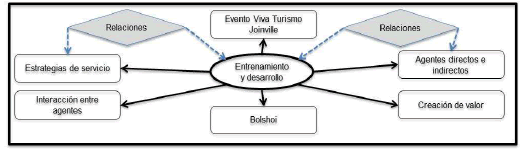 El análisis realizado referente al aspecto atractivo de ocio, como se muestra en la Figura 2, señala la existencia de dos relaciones (líneas entrecortadas): una entre los atractivos de ocio y la estrategia de servicios y otra entre los atractivos de ocio y la red relacional, agentes directos e indirectos, que también representan recursos y capacidades disponibles según se describe en los discursos: “[…] para el periodo del Festival de Danza, como nosotros tenemos el stand allí, entonces además de ofrecer el paseo al Beto Carreiro, ofrecemos el paseo del Barco Príncipe, el Turismo Rural de aquí de Joinville, […] Pomerode, Blumenau, Brusque, Balneario Camboriú, incluso hasta la Madre Paulina. Entonces montamos paquetes con salidas regulares y los ofrecemos a los turistas”. Según lo anterior, la interacción entre los agentes se demuestra y se caracteriza como parte de la relación.