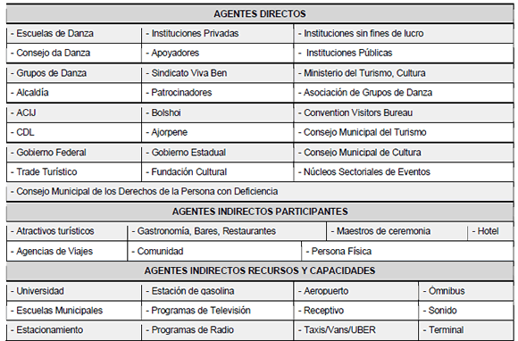 Buscando mapear la configuración de la red relacional del Festival de Danza de Joinville, se dividió a los agentes en dos grupos: a) directos, los que tienen relación directa con la planeación, captación de recursos, organización y realización del evento; y b) indirectos, subdivididos en dos grupos, los agentes indirectos participantes que incluyen a todos aquellos que ofrecen la estructura en la ciudad para cubrir la demanda referente a cualquier evento y los agentes indirectos en tanto conjunto de recursos y capacidades, que se refiere al grupo de recursos que ayudan en la estructura de apoyo de la ciudad, según se ilustra en el Cuadro 2.