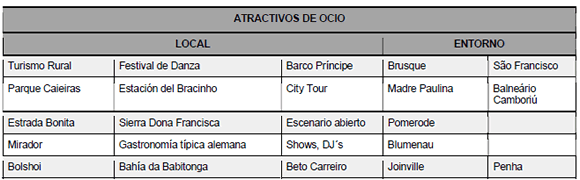 Los atractivos de ocio, tales como productos y paquetes turísticos, atracciones culturales, gastronomía, eventos especiales, historia y cultura de la ciudad e histórico de disponibilidad de alojamiento, son elementos críticos para competir en la industria del turismo, dado que actúan como las principales fuentes de diferenciación (Crouch, 2007; Vinyals-Mirabent, 2019). El Cuadro 3 muestra los atractivos de ocio reconocidos por los entrevistados. Cabe destacar que fueron reconocidos los atractivos de ocio ofrecidos en la ciudad y, como resultado de su localización privilegiada y de la formación de convenios, también fueron citados otros atractivos de esparcimiento de los municipios cercanos a la ciudad de Joinville.