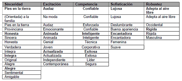 De acuerdo con Maehle, Otnes & Supphellen (2011) las marcas relativas a la dimensión sinceridad forman parte de la rutina de los individuos y son utilizadas con frecuencia, como alimentos y bebidas. En este grupo también están aquellas percibidas como capaces de ofrecer una experiencia de servicio positiva y de concretar las expectativas de los consumidores. Las marcas percibidas por las características de la dimensión Competencia comportan representantes de grandes empresas, generalmente con tradición en el mercado, cuyos productos son líderes del segmento. Con mayor frecuencia los consumidores asocian la dimensión Competencia a las marcas detentoras de una elevada tecnología, dada la percepción de elevados estándares de calidad.