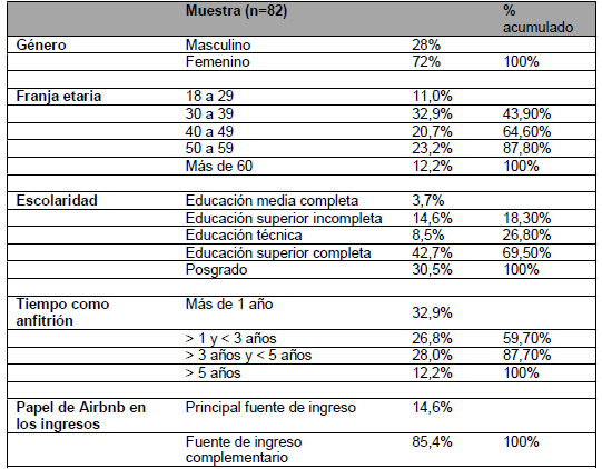 En relación al perfil de la muestra, exhibida en la Tabla 1, la distribución en cuanto al género es predominantemente femenina. En relación a la franja etaria se destaca la madurez. Los anfitriones con hasta 30 años forman el menor grupo (11%), mientras se observa concentración de individuos a partir de los 40 años contabilizando más de la mitad de la muestra. Referente al grado de escolaridad se verificó que el 70% de la muestra completó al menos la educación superior (42,7%) o un posgrado (30,5%). Para la mayoría del grupo estudiado, Airbnb corresponde a un complemento de su ingreso (85,4%), siendo pocos los anfitriones profesionales (14,6%). De los 82 participantes, el 59,8% afirmó ser anfitrión al menos desde hace 1 año o desde hace entre 1 y 3 años. Los anfitriones más experimentados, más de 3 y menos de 5 años o más de 5 años sumaron cerca del 40,2% de la muestra.