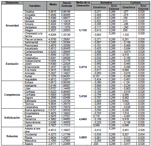En relación a los trazos de personalidad (las variables de cada dimensión), se destacan Creativa (=5,8415), Actualizada (=5,9512), Exitosa (=5,9512), Buena apariencia (=5,6707) y Adepta al aire libre (= 4,4512). Las variables Inteligente y Contemporánea también están entre las cinco mayores medias en general. Por otro lado, las medias más bajas dentro de cada dimensión fueron: Provinciana (=3,4878), Inigualable (=4,9512), Corporativa (=4,5976), Lujosa (=3,7927) y Áspera ( = 2,871). Vale destacar también que las variables Masculina y Deslumbrante presentaron medias que las ubican entre las peores. De forma similar a lo hallado por Lee & Kim (2017), las variables pertenecientes a la dimensión Robustez obtuvieron las menores medias y la variable Exitosa entre las medias más altas.