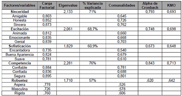 En relación al KMO, son valores aceptables aquellos entre 0,5 a 1,0 (Hair et al., 2009). Por lo tanto, un resultado inferior a 0,5 indica que el análisis factorial es inaceptable. Como indica la Tabla 3, el KMO de todas las dimensiones presentó correlaciones aceptables entre las variables, siendo la dimensión Competencia la mayor (KMO = 0,713), seguida por orden decreciente por Excitación (KMO = 0,698), Sinceridad (KMO = 0,693), Sofisticación (KMO =0,673) y Robustez (KMO = ,620).