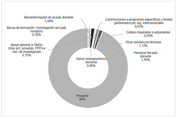 Además, la forma en que llega esta AOD es muy simplista, a través de donaciones estándar no reembolsables a proyectos específicos, obviando el amplio abanico de instrumentos de cooperación y de instrumentos financieros de los que se sirve la AOD.