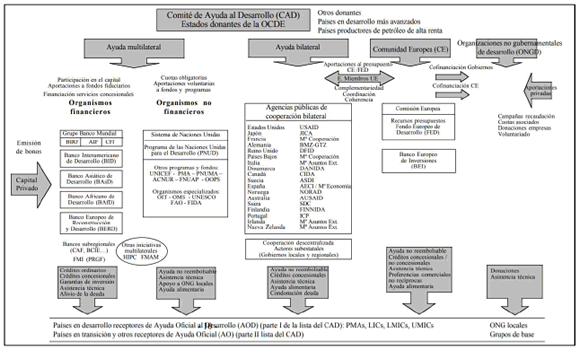 En función de los recursos y los agentes que intervienen en la canalización de la ayuda, la cooperación internacional puede adoptar distintas formas: según el origen (privada o pública), o el tipo de financiación (reembolsable o no reembolsable), dependiendo del modo de canalización (multilateral, bilateral, descentralizada, no gubernamental y empresarial), y en función de la situación geopolítica, tanto de los países donantes como de los receptores de la cooperación (vertical, horizontal o triangular) (Gonserbatt, 2009). La Figura 1 recoge un resumen elaborado por Sanahuja (2001: 10) sobre el sistema internacional de ayuda al desarrollo, detallando actores e instrumentos.