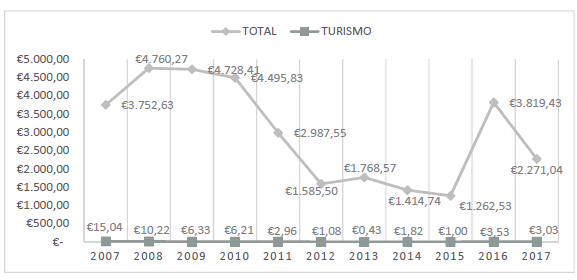 Desde 2007, la AOD neta desembolsada por España asciende a un total de 32.846.509.292,45€, de los cuales 51.636.574,52€ se han destinado a turismo. La evolución anual de estas cifras puede observarse en la Figura 2. Ésta refleja la amplia distancia que existe entre la AOD total y la desembolsada al sector del turismo.