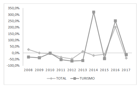 La Figura 3 muestra la evolución de la tasa de variación interanual de la AOD total y la desembolsada al turismo. La AOD destinada al turismo comienza a mostrar tasas de variación negativas ya desde 2008, pero la total no lo hace hasta dos años después. A partir de entonces mantienen una senda de crecimiento similar, aunque el repunte de la cooperación al desarrollo es bastante más tardía en el caso del turismo, que no alcanza tasas de variación equiparables a las de la AOD hasta 2015.