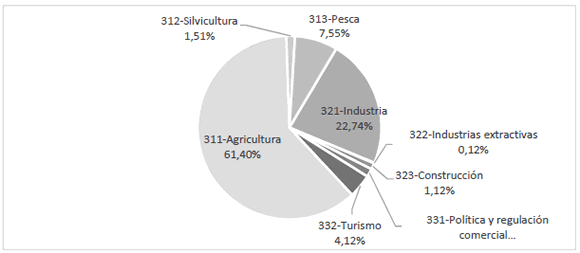 El grupo 3 de los sectores CAD representa a los sectores productivos de las economías a las que destinan la AOD. La Figura 4 muestra el reparto de la AOD destinada a estos sectores en ALC desde 2007. Los sectores de la agricultura (61,40%) y la industria (22,74%) reciben más de la mitad de la AOD española destinada a sectores productivos en ALC. El resto de la ayuda se reparte entre otros seis sectores. EL turismo ocupa el cuarto lugar después de la pesca (7,55%).