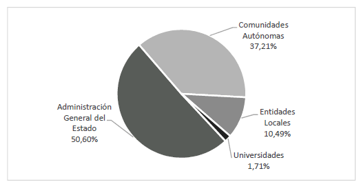 Los actores que emiten estos 26 millones de euros de AOD al turismo para ALC, quedan reflejados en la Figura 5. La mitad ha sido emitida por la Administración General del Estado y la otra mitad se ha repartido entre las Comunidades Autónomas (CCAA, en adelante) (37,21%), las Entidades Locales (10,49%) y las Universidades.