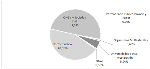 Esta AOD es emitida, principalmente, por el Estado y las CCAA, canalizada a través del propio sector público, la sociedad civil y ONGs y realizada directamente al país receptor de la ayuda (cooperación bilateral).