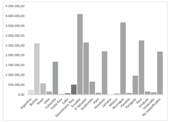 Es fundamental conocer qué países latinoamericanos y caribeños reciben esta AOD al turismo (Figura 7). Al fin y al cabo, la adjudicación de esta ayuda depende mucho de las relaciones internacionales de los actores emisores con estos países, así como de sus necesidades y nivel de desarrollo de la actividad turística y de la economía en general. Los países de ALC que más AOD al turismo han recibido desde 2007 son Ecuador (15,84%), Nicaragua (14,20%), Perú (10,69%), El Salvador (10,27%), Bolivia (10,10%) y Honduras (8,57%). Obteniendo entre todas ellas el 70% de esta ayuda. Por el otro lado, han recibido menos del 0,50% de la AOD al turismo en ALC: Haití (0,45%), Panamá (0,41%), Cuba (0,36%), México (0,30%) Costa Rica (0,20%) y Jamaica (0,01%).