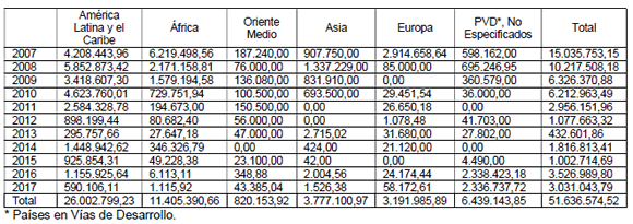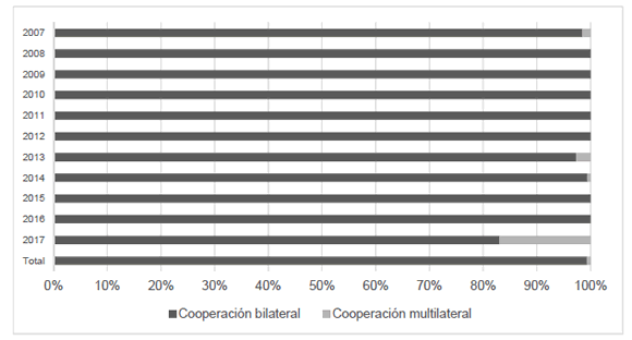 Como ya se ha adelantado, menos de un 1% es canalizado a través de organismos multilaterales, por lo que el 99,31% se realiza a través de cooperación bilateral. Sólo en 2007, 2013, 2014 y 2017 se canalizó esta ayuda a través de cooperación multilateral (Figura 8).