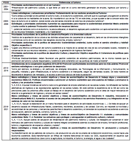 El turismo está presente es estos planes, cierto que no como sector estratégico, pero sí como herramienta de actuación. Véase la Tabla 1, en la que se resumen las referencias al turismo en los diferentes PDCE.