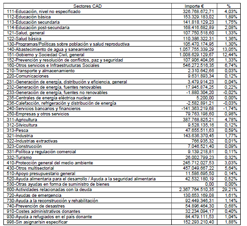 Vázquez & Martín (2009) justifican esta reducción de la AOD en ALC por la modificación del “mapa de la ayuda”, para lograr los ODS y cumplir con la Agenda Internacional de Eficacia de la Ayuda, de manera que ésta se ha ido orientado cada vez más hacia los países con mayor nivel de pobreza, reduciendo así su presencia en los países de desarrollo intermedio, en general, y en ALC, en particular. La Tabla 3 muestra el reparto de la AOD por sectores CAD en ALC desde 2007.