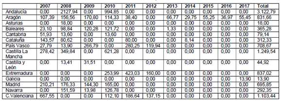 El detalle de las CCAA que han emitido AOD al turismo a ALC se muestra en la Tabla 4. En líneas generales, puede decirse que las CCAA condensan esta ayuda en años puntuales, los cuales se han concentrado antes de 2012. A partir de entonces apenas se realiza cooperación para el desarrollo en materia de turismo en ALC. Sólo Aragón mantiene esta partida presupuestaria hasta 2017, aunque el importe se haya visto reducido cada año, de media, a la mitad.
