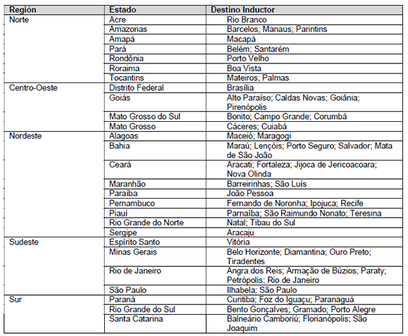 Los destinos inductores son los 65 municipios elegidos por el MTur, que tendrían el rol de inducir al desarrollo en los respectivos itinerarios y regiones y deberían ser trabajados para alcanzar un “modelo de calidad internacional de mercado” (Brasil, 2007: 52). Con la intención de realizar un diagnóstico detallado de la realidad de los destinos inductores, el MTur, en asociación con la Fundación Getulio Vargas (FGV) y el Servicio Brasileño de Apoyo a las Micro y Pequeñas Empresas (SEBRAE Nacional) creó en 2008 la metodología del índice de competitividad turística nacional (ICT).